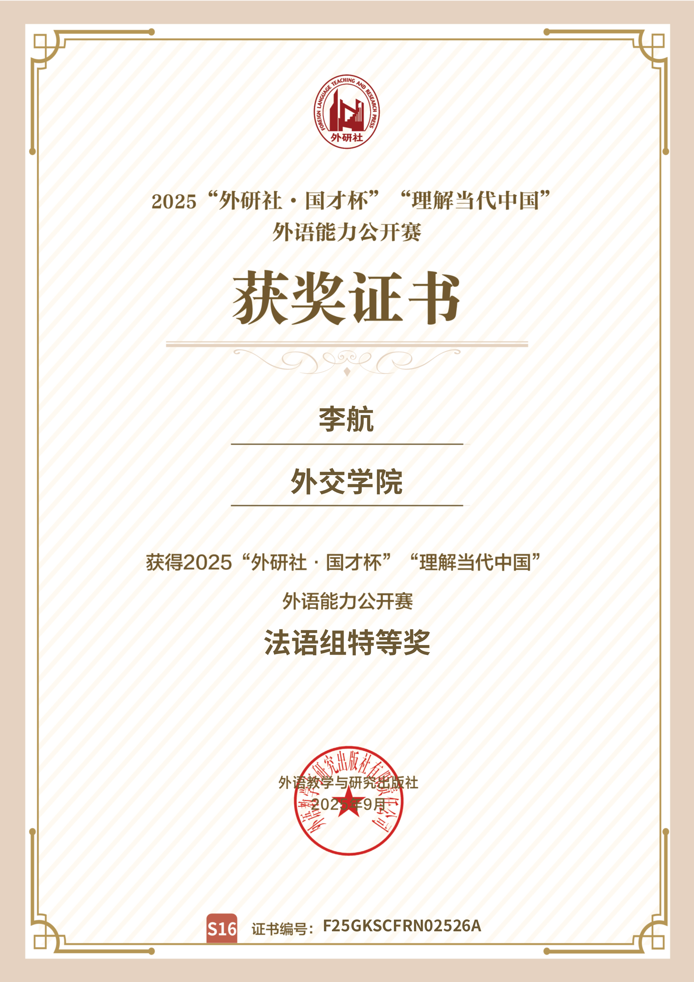 自赛事启动以来,李航同学在导师刘碧霞副教授的精心指导下,始终以高标准严格要求自己,充分发挥专业优势,深入研读《理解当代中国》系列教材,系统梳理了中国特色大国外交、“一带一路”倡议、人类命运共同体等重要议题。本次荣获“国才杯”全国公开赛法语组特等奖,不仅是对李航同学个人能力的充分肯定,也充分彰显了我院学生培养的扎实成效。