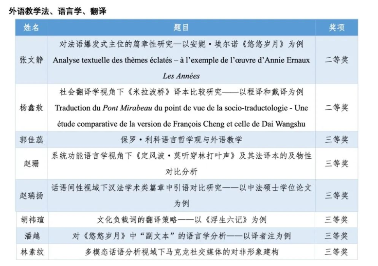本次法语分论坛设立3组平行论坛,分别为外语教学法、语言学、翻译论坛,法语文学论坛以及法语国家与地区研究论坛。论坛采用线上方式举办,参会人员通过腾讯会议进入论坛,实时交流研讨。外语教学法、语言学、翻译论坛由北京外国语大学法语学院傅荣教授主持。他和北京航天航空大学的萨日娜副教授以及北京外国语大学的谈佳副教授共同进行了点评。我院研究生部2022级法语语言文学专业杨鑫敖同学获得了该组别二等奖(本组别未产生一等奖)。