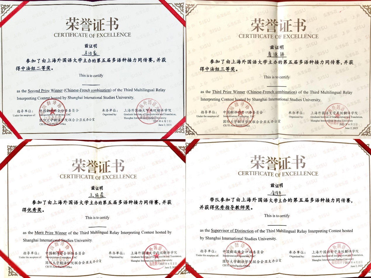 我校法语语言文学专业研一的三名同学经历线上初赛成功入围线下决赛,在多语种接力同传的现场比拼中取得了出色的成绩:马浩家同学获二等奖;詹源锦同学获三等奖;王晓晨同学获优秀奖。同时,金俊华老师获得了优秀指导教师奖。