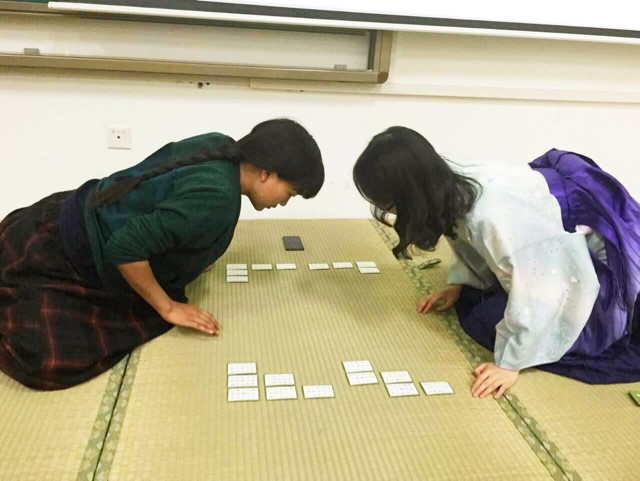 之后,两位同学针对纸牌技法进行了教学,介绍了“一字诀”的8张牌的记忆方法,随后大家两两展开练习。坐在榻榻米上,耳边传来悠长的读牌声,仿佛身处和室,沉醉于和风的优雅与激情之中。时间飞逝,不觉到了结束的时间,短暂的一个半小时时间中,大家亲身体验了日本文化,以歌牌的形式学习日语、欣赏文化、了解日本,而终陶醉其中、受益匪浅。