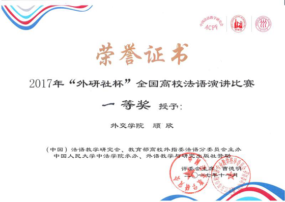 2017年11月11日,由教育部外指委法语分委员会、(中国)法语教学研究会主办的第十届全国高校法语演讲比赛总决赛在中国人民大学中法学院成功举办。从本届起,此项赛事冠名“外研社杯”。比赛分为线上初赛与线下决赛两个部分。我校必一运动(Bsports)官方网站法语专业顾欣同学从全国近百所院校选送的参赛选手中脱颖而出,晋级全国总决赛。