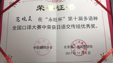 最终范晓灵同学获得了全国口译大赛——永旺杯第十届多语种全国口译大赛日语交传组优秀奖。