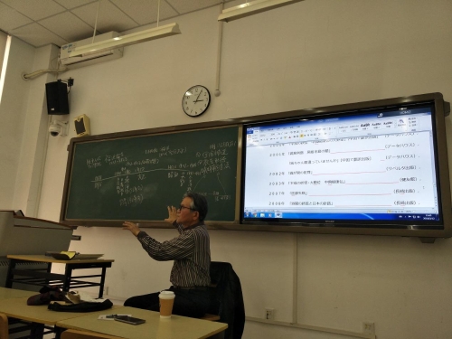 本泽先生的演讲结束后,日语专业的师生积极提问,就演讲的内容以及其他相关问题热烈讨论,交换意见,长达两个半小时的演讲慢慢接近尾声。