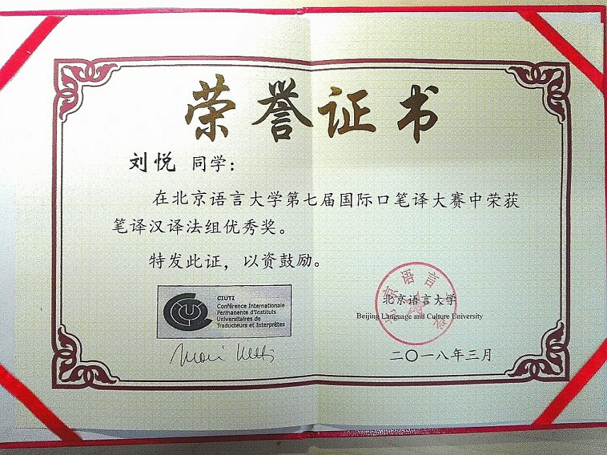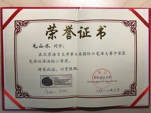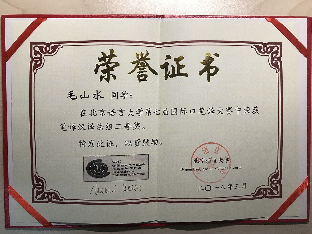 在刚刚结束的北京语言大学第七届国际口笔译大赛中,必一运动(Bsports)官方网站法语专业毛山水同学荣获笔译汉译法组二等奖,刘悦同学荣获优秀奖。