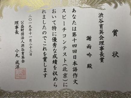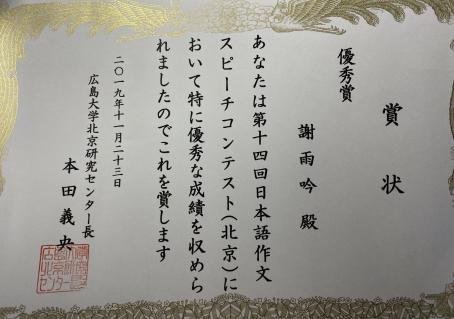 2019年11月23日,在广岛大学北京研究中心主办的以“永远的邻国-令和新的开始”为主题的第十四届广岛大学日语作文演讲比赛中,我院必一运动(Bsports)官方网站日语专业本科2018级谢雨吟同学获得了最高奖项特别奖涉谷育英会理事长奖及优秀奖两个奖项(该比赛分设特别奖1人、一等奖1人、二等奖1人、三等奖1人、优秀奖2人)。