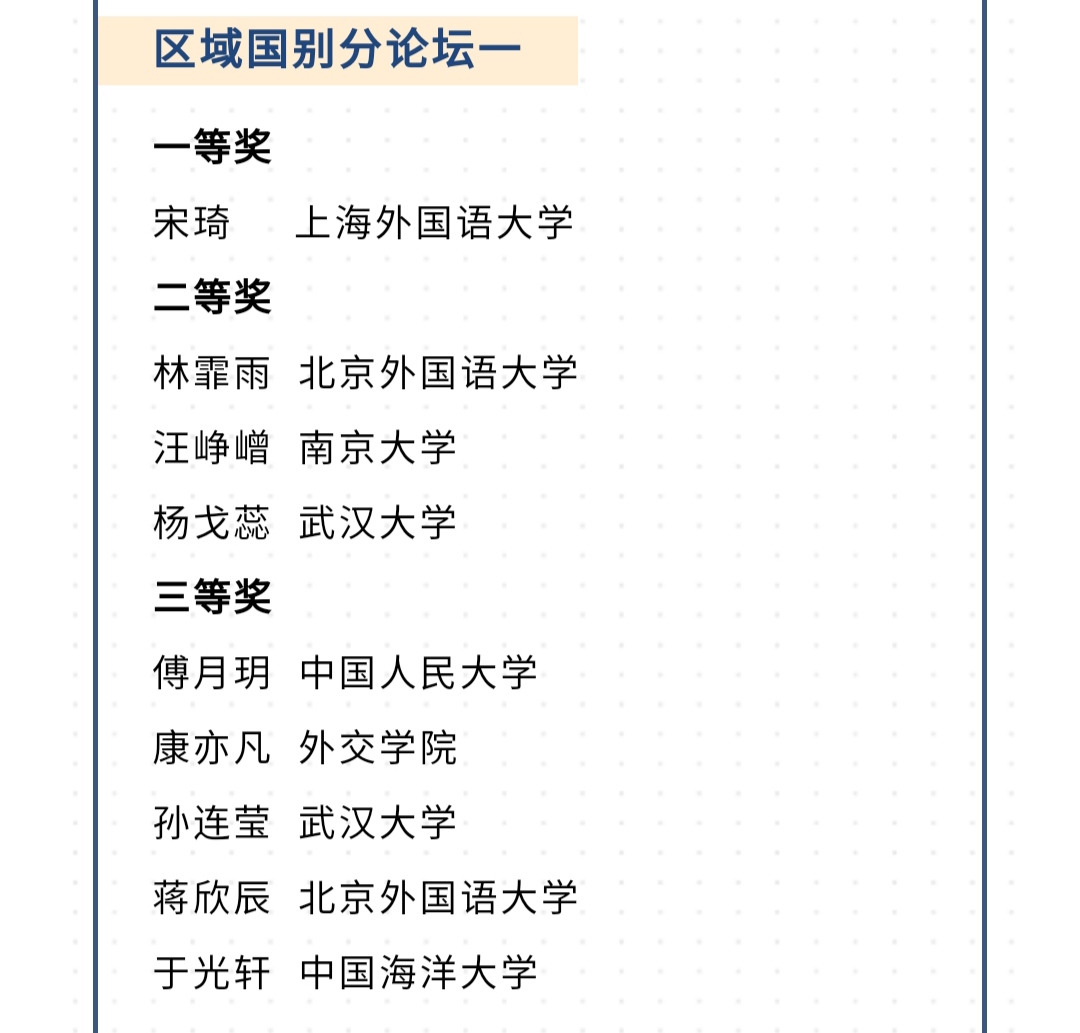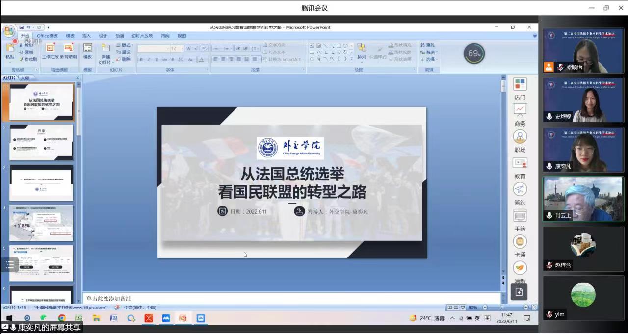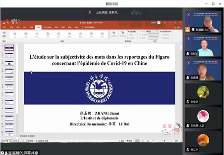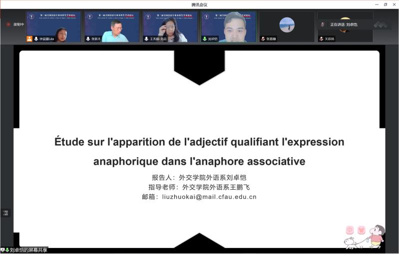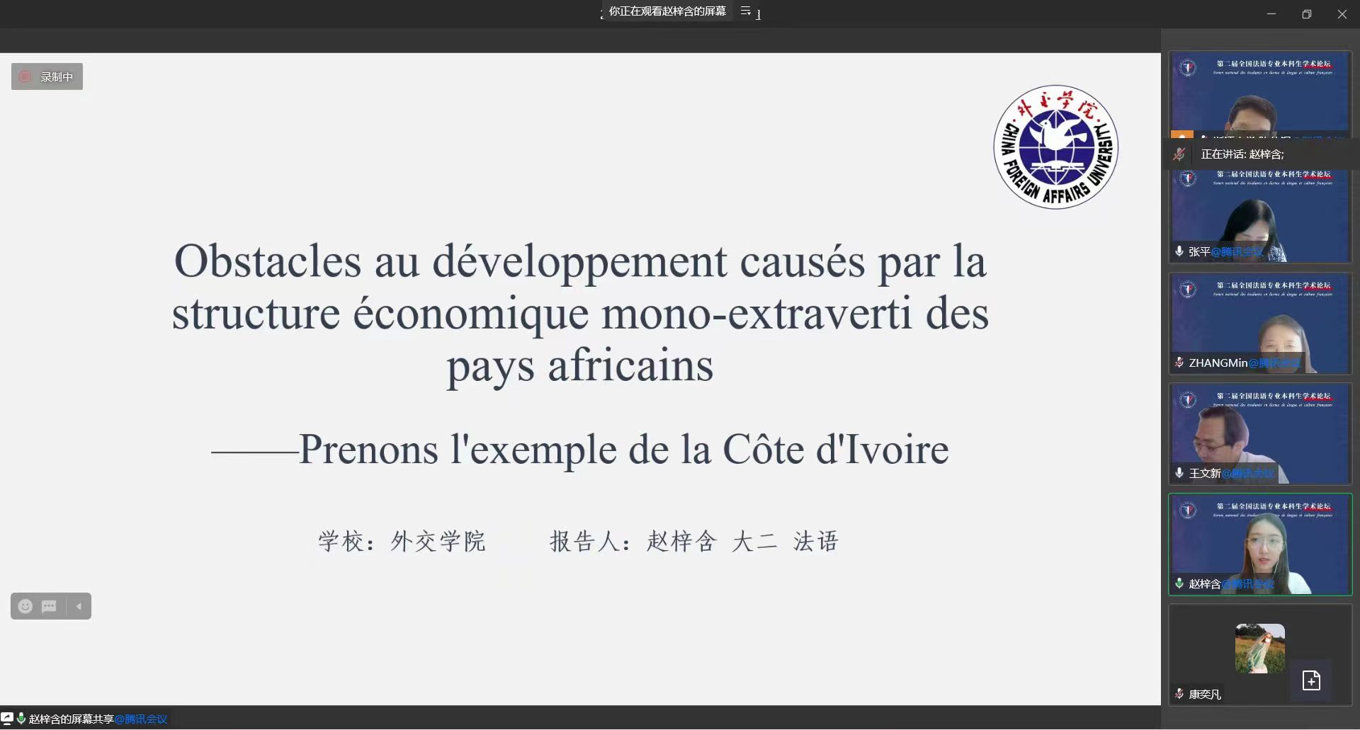 论坛中,2019级刘卓恺同学提交的论文《法语联想回指中形容词依附于回指词的条件研究》从前沿理论出发,分析了联想回指中形容词依附于回指词时对文本连贯性的干扰,并总结了允许回指词被形容词依附的四种情况。2018级张嘉穗同学提交的论文《对〈费加罗报〉涉华疫情报道的主观性的研究》从话语层面出发,分析了《费加罗报》对中国疫情的报道中的主观性成分,进而概括了法媒视角下的中国形象。2020级康奕凡同学提交的论文《从法国总统选举看国民联盟的转型之路》紧跟时事,分析了影响力与日俱增的法国极右翼政党国民联盟为了适应新时代条件所进行的改革,并对该政党未来的行动纲领做出了预测。2020级赵梓含同学提交的论文《非洲国家单一经济结构造成的经济发展阻碍----以科特迪瓦为例》将目光投向非洲,以科特迪瓦为例,分析了单一的经济结构在全球化背景下对该国经济发展造成的负面影响,并给出了相应政策建议。几位同学的精彩发言获得了与会评委的一致好评。最终,刘卓恺同学获得语言学分论坛二等奖,康奕凡同学获得区域国别分论坛(一)三等奖,赵梓含同学获得区域国别分论坛(二)三等奖。