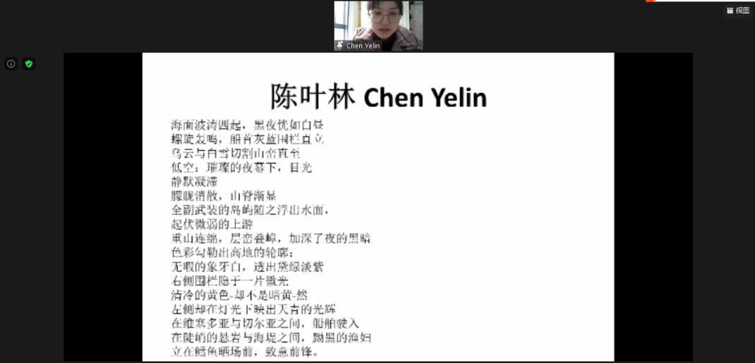 受疫情影响,半决赛采取线上比赛形式,选手们用法语围绕初赛提交的翻译文本阐述各自对所译诗歌的理解及整体翻译理由,并即兴回答评委老师们提出的问题。比赛中,陈叶林同学语言优美、思路清晰、表现自如,获得了评委老师的高度赞赏,同时也对我系法语教学成果予以充分肯定。