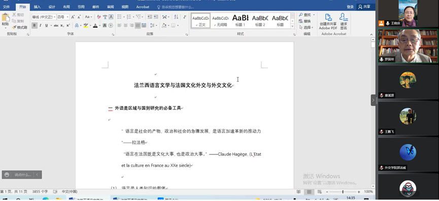 2021年10月27日下午,我院必一运动(Bsports)官方网站法语国家研究中心邀请武汉大学国际问题研究院教授罗国祥老师举办题为“法国语言文学与法国文化外交和外交文化”的讲座,必一运动(Bsports)官方网站主任兼法语国家研究中心主任王晓侠教授主持了会议。此次学术讲座以线上形式举行,必一运动(Bsports)官方网站师生四十余人在线聆听了讲座。