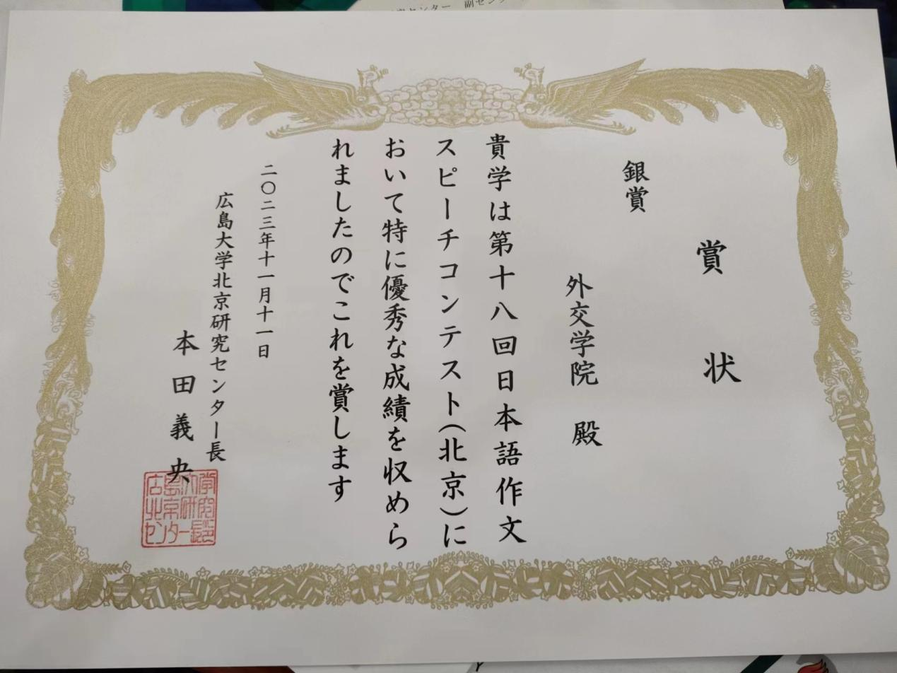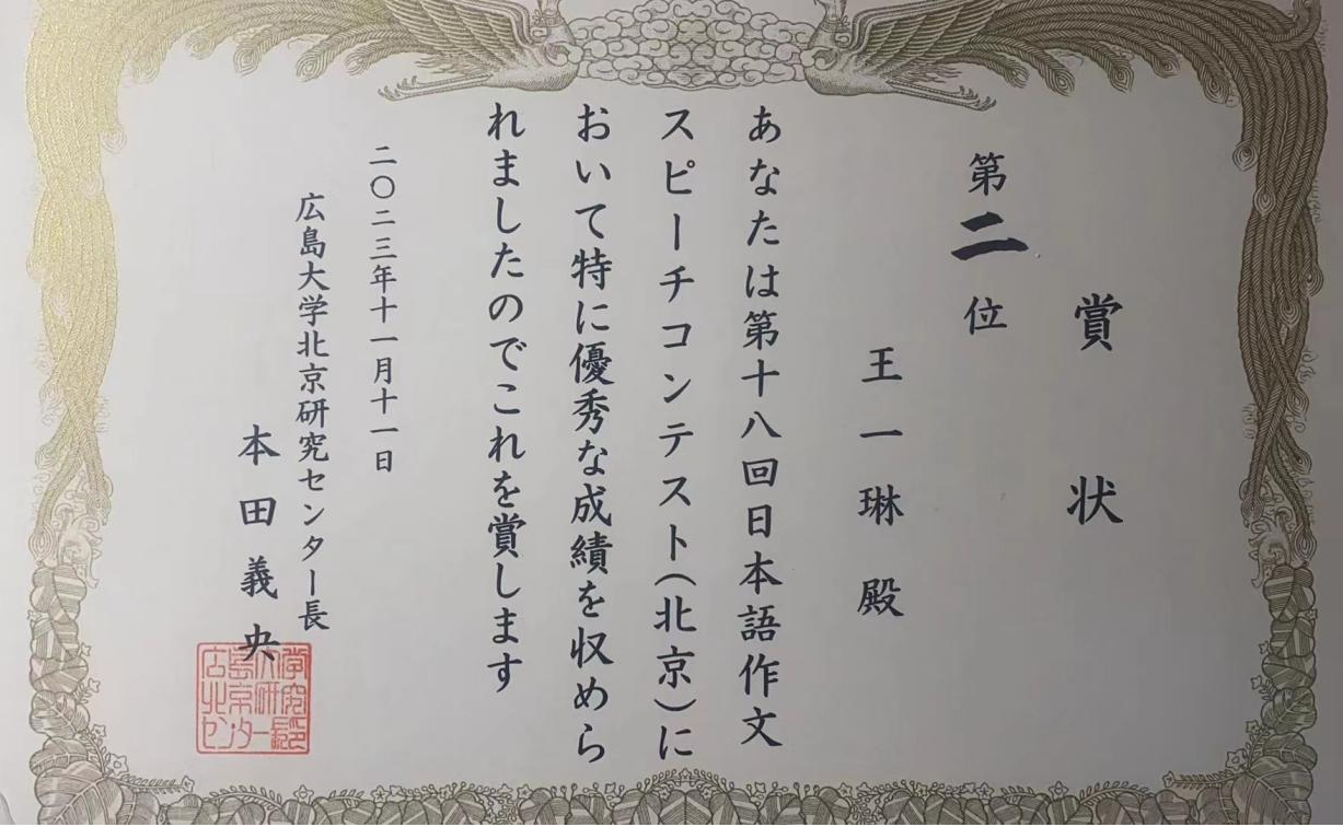 2023年是《中日和平友好条约》缔结第四十五周年,广岛大学北京研究中心面向全国日语专业学生开展了以“中日和平友好条约缔结四十五周年之际”为主题的日语作文征集活动。经校内选拔,日语专业最终选出王一琳、陈雨茜、王淇、李惠雅、徐美媛五位同学参加作文评比,五位同学灵活运用所学知识,皆取得了优异成绩,展现了我院学子的风采和我院优秀的教学水平。其中,王一琳同学入围决赛,在向坂卓也老师、铃木昭吾老师的指导和马如慧老师的帮助下,以出色的表现获得个人奖二等奖,b体育必一运动日语专业获得团体奖银奖。