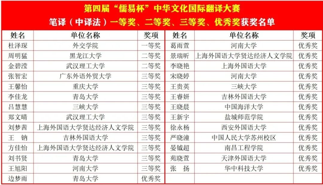 喜报:我院法语专业研究生在第四届“儒易杯”中华文化国际翻译大赛中斩获一等奖