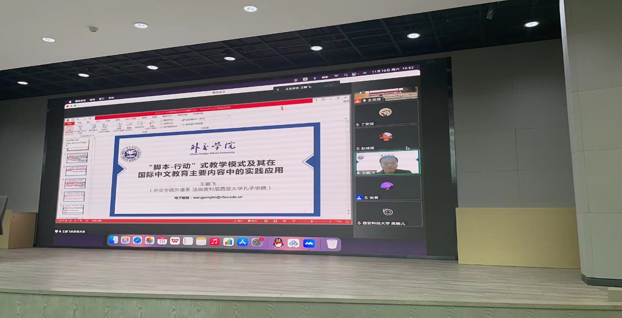 王鹏飞老师兼任我院作为中方院校的的法属波利尼西亚大学孔子学院中方院长,承担多项国际中文教育领域研究课题。此次研讨会上,王鹏飞老师受邀作了主题为《“脚本-行动”式教学模式及其在国际中文教育中的实践应用》的主旨发言,发言以适应于国际中文教育发展新要求的“脚本-行动”式特色教学模式,重点结合法波大学孔院在国际中文教育理论和实践创新方面的探索与尝试,为国际中文教育的新发展提供了教育教学方法论层面的启发。