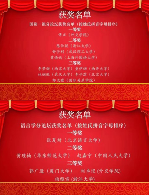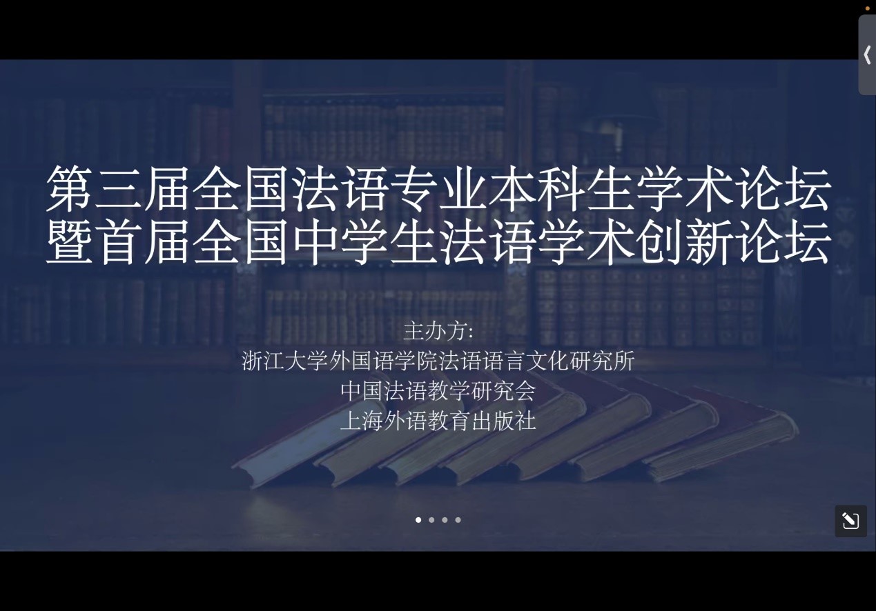 近日,由中国法语教学研究会主办、浙江大学外国语学院法语语言文化研究所和上海外语教育出版社联合承办的第三届全国高校法语专业本科生学术论坛隆重召开,我院法语专业七位学生通过论文前期评审入围此次论坛,进行现场论文宣读,并斩获佳绩。2020级傅正同学(指导教师:金俊华)摘得区域国别一组一等奖,2020级田俊朋同学(指导教师:于蓓)、2021级罗佳敏同学(指导教师:唐溪源)获区域国别二组三等奖,2019级刘卓恺同学(指导教师:王鹏飞)获语言学组三等奖。