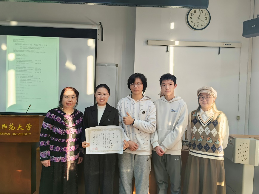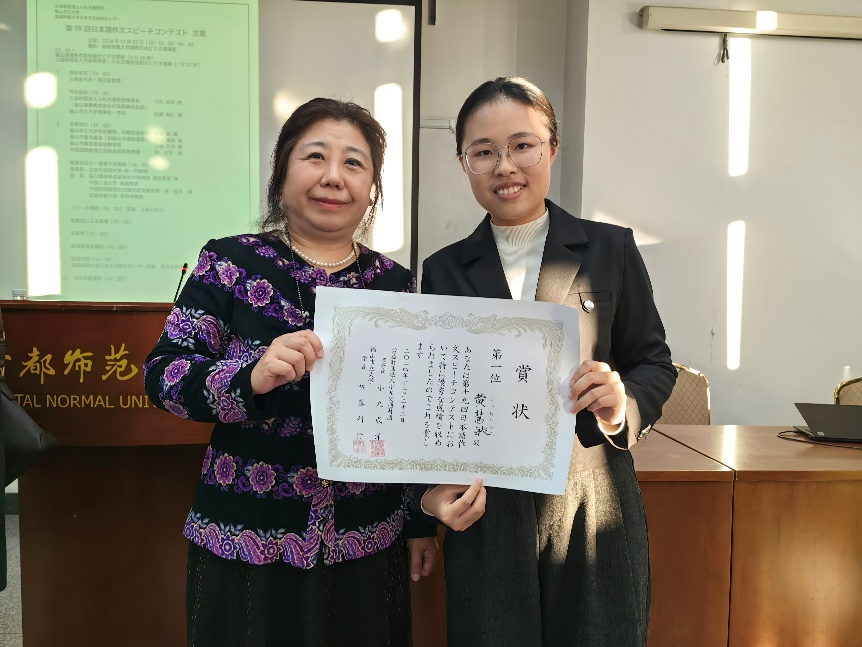祝贺黄慧敏同学获得“第十九届日语作文演讲大赛”一等奖,同时感谢此次比赛的指导教师史兆红教授对选手的悉心辅导,以及带队参赛。