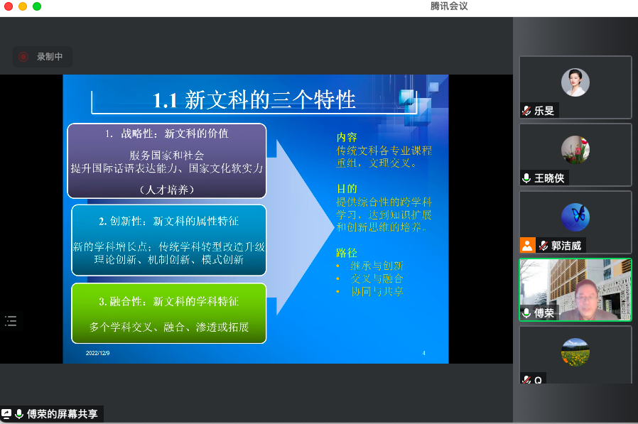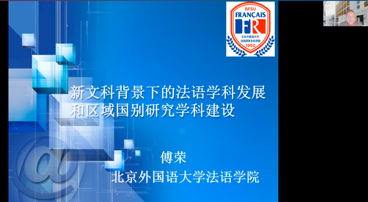 傅荣教授首先对“新文科背景下的法语学科发展和区域国别研究学科建设”这一讲座主题进行了系统的解读。他从“新文科”概念的出现、演变和发展历程说起,对新文科的内涵作出了阐释,对其特性和目标进行了归纳,并梳理了新文科对外语学科所产生的影响。接着,傅荣教授又对法语学科的发展史和各个研究方向进行了回顾,并着重阐述了发展法语学科的前提因素和必由之路。在第三部分中,傅教授通过引用国务院学位委员会的相关论述对区域国别研究的范围进行了界定,重点探讨了区域国别学科知识的整体构成要素。在第四部分中,傅荣教授基于对上述三个概念的理解和认识,提出了“区域国别学科建设”和“法语等外语学科发展”之间的关系“是什么”、“为什么”和“怎么处理”三大问题并作出了细致的解答,同时对外语专业的基本原则、三级目标、发展路径给出了切实可行的建议。