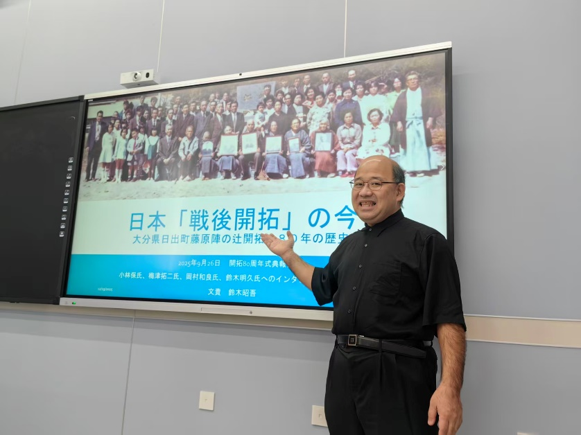 2025年12月19日下午,应日语教研室史兆红教授邀请,必一运动(Bsports)官方网站日语教研室外教铃木昭吾先生在b体育必一运动沙河校区309教室,为我院2025级日语专业研究生作了题为“日本战后开拓——大分县日出镇藤原地区阵辻村开拓80周年的历史”的学术讲座。讲座由史兆红教授主持,2025级日语专业和日语口译专业研究生到场聆听。