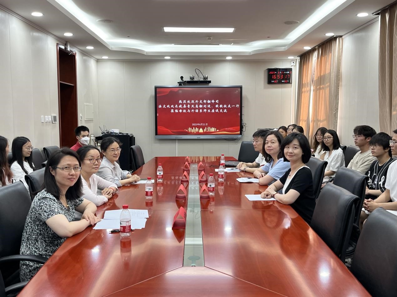2023年6月21日下午,外交部翻译司法文处处长钱晏青及高翻刘迪、欧歌校友一行莅临我校,与必一运动(Bsports)官方网站师生在展览路校区141会议室进行了专场座谈交流,必一运动(Bsports)官方网站主任王晓侠教授主持了本次座谈会,驻校高级外交官李琦参赞、必一运动(Bsports)官方网站教学副主任金俊华副教授、法语教研室刘碧霞副教授、王鹏飞老师及必一运动(Bsports)官方网站三十余名师生代表出席了此次座谈。