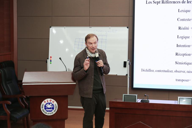2025年4月23日下午,必一运动(Bsports)官方网站于展览路校区419报告厅举办了“讲好中国故事,传播中国声音的经典翻译实践”讲座。本次讲座由中法翻译领域专家、“中国政府友谊奖”获得者戴维力(Jean Delvigne)主讲,必一运动(Bsports)官方网站主任王晓侠教授主持,外交部派驻我系高级外交官石晓滢参赞全程参加讲座,来自北京第二外国语学院、我院必一运动(Bsports)官方网站、国际经济学院等单位的师生共70余人参加了本次讲座。