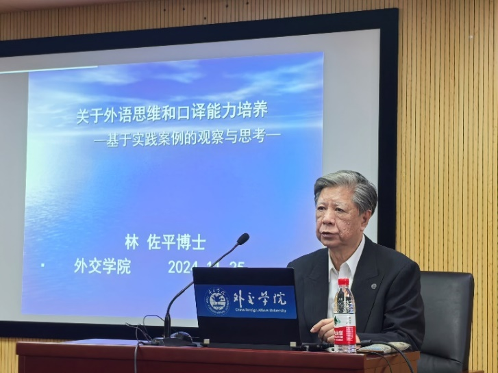 林佐平博士结合自己的学习、工作经历以及党的二十大报告,为同学们讲解在口译实践中需要注意的事项。他强调,外语思维是指在目标语言环境中直接用该语言进行思考、推理和表达的能力,而口译能力则包含语言理解、即时记忆、信息提取与精准表达等多维技能,是语言能力和交际能力的综合体现,同时,林博士还结合自己在武钢工作的经历,强调外语思辨的重要性,外语思辨要求学习者能够脱离母语思维的限制,在目标语言的框架下,独立、批判性地看待问题、组织语言和表达观点。