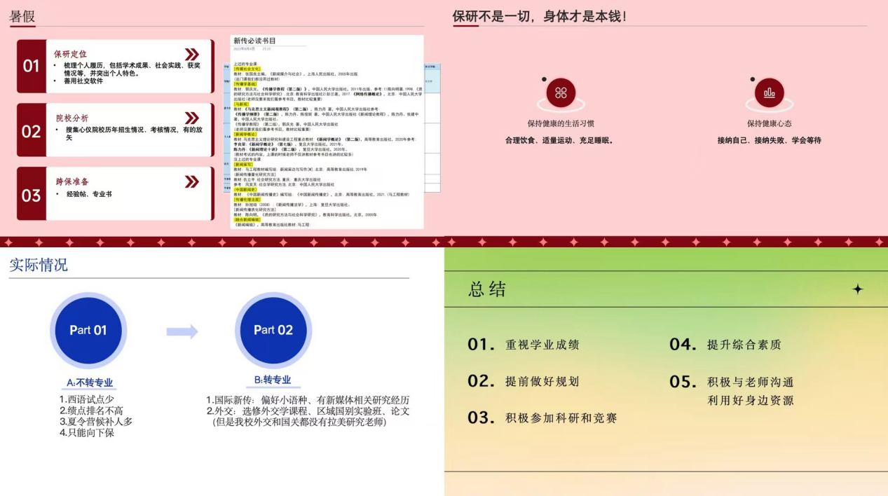 第四位进行分享的是西班牙语专业的覃纤睿学姐,她保研到了中山大学的国际新闻与传播专业。覃学姐首先介绍了自己的保研专业和个人情况,紧接着详细介绍了自己的保研时间线和流程以及不同学校的考试风格。同时也要善于自己寻找信息,运用好身边同学老师的资源和社交媒体上的经验分享。覃学姐还提出,同学们要重视语言学习,打好基础,先保持本专业的语言优势,同时也要重视英语的学习。当然自学新的专业课程,做好主修与辅修的兼顾也是一件极具挑战性的任务。覃学姐还建议大家可以寻找适合自己的“保研搭子”,相互鼓励共同进步。在冲刺阶段,谦虚学习、放好心态并积极自省则是助力上岸的不二良方。最后覃学姐提醒大家保研不是一切,身体才是本钱,即使面对保研这一人生大事,也要保持健康的生活习惯和健康的心态.