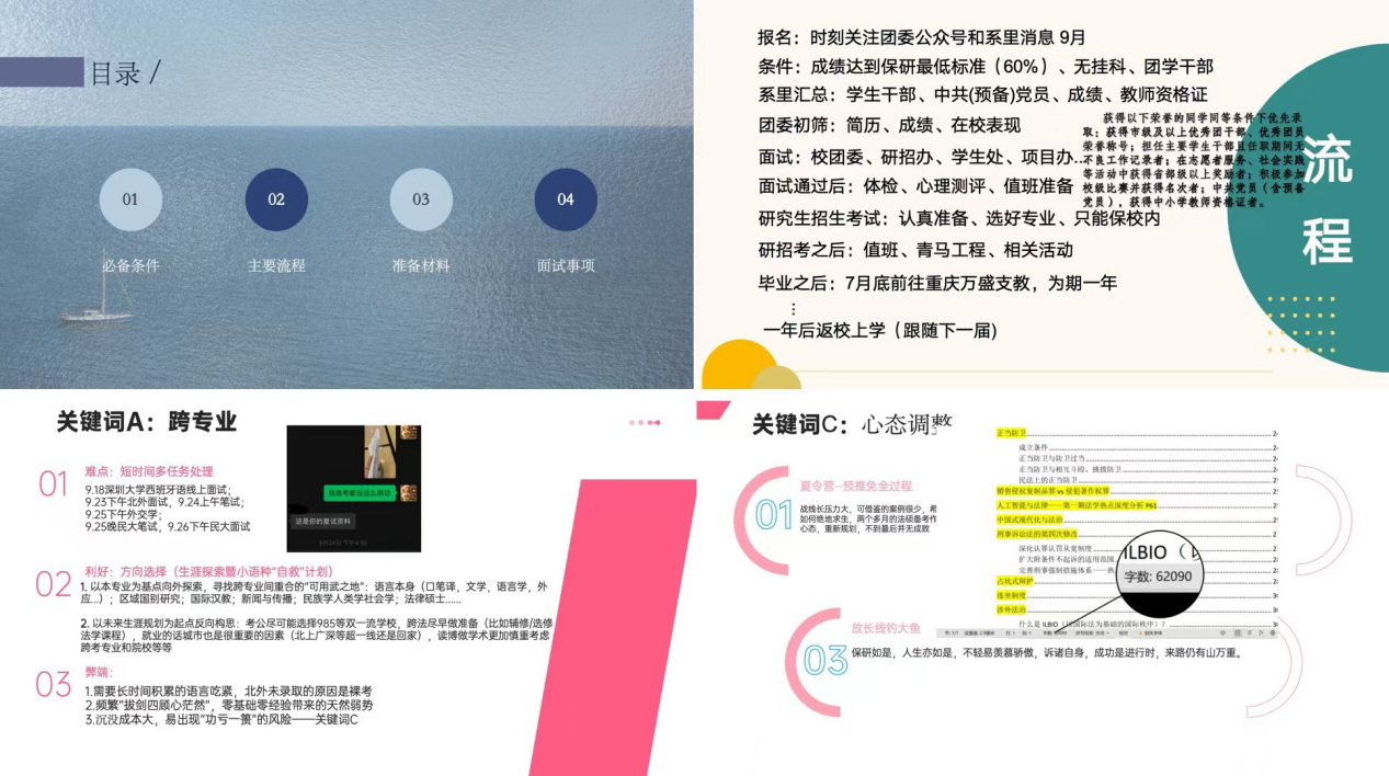 首先,进行分享的是来自日语专业的车瑾学姐,她保研到了b体育必一运动的国际关系专业。车学姐从保研的必备条件,主要流程,准备材料和面试事项四个方面详细介绍了自己的保研之旅。车学姐向同学们强调了均衡学习、活动、科研与实习的重要性,尤其是对于我们小语种学习者英语成绩的必要性。其次,科研与竞赛是保研材料中的亮点与重点,也是与其他学生竞争的重头戏。当然多多参加实习与其他实践活动当然是加分项,可以展示出自己的综合实力与丰富经验。