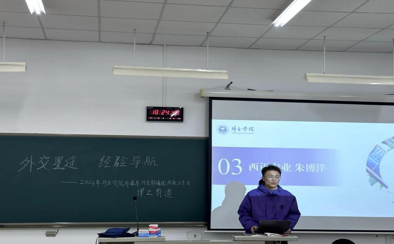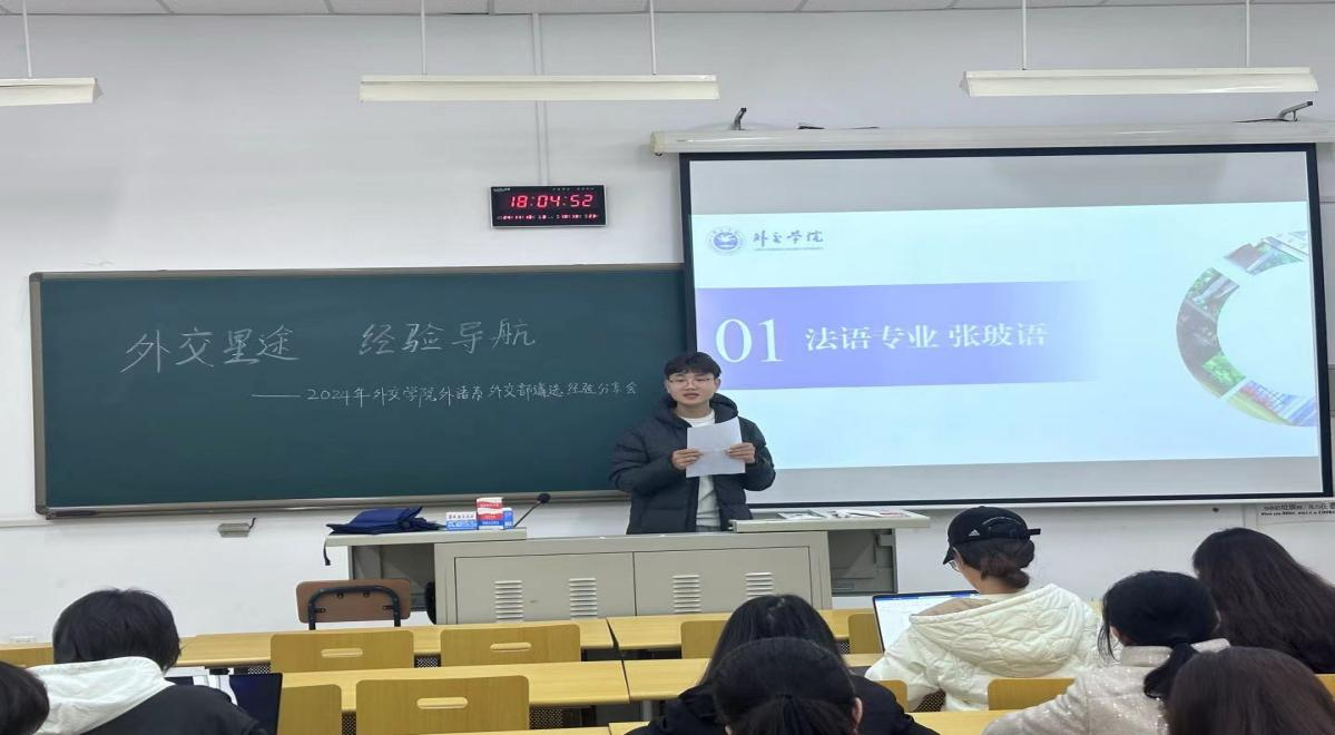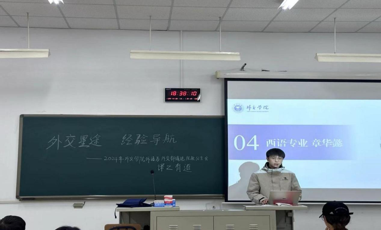 最后进行分享的是2022级西班牙语专业的章华懿同学。章同学首先详细全面地介绍了外交部遴选考试的流程。他建议同学们在进行面试前要做好充足的心理建设和前期准备,在日常生活中做好专业术语的积累,此外针对于已经拿到遴选的资格的同学们,章同学强调要积极参加学校组织的培训,积极向专业的老师提问。最后,章同学告诉同学们,人生也有很多不同的选择,我们要认准自身的方向,做好自己的人生选择。