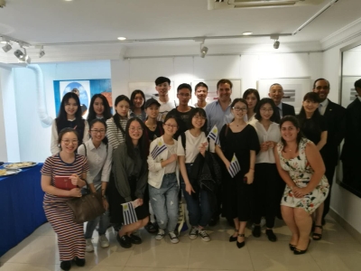 大使介绍完毕后,同学们踊跃提问。尽管多低年级同学,但无论高起或零起,其口语水平令大使阁下及其他乌外交官称赞不已。同学们珍惜机会,纷纷主动与大使及其他外交官交谈。乌使馆特意准备了乌拉圭风味的点心供同学们品尝。现场双方交谈甚好,其景融融。