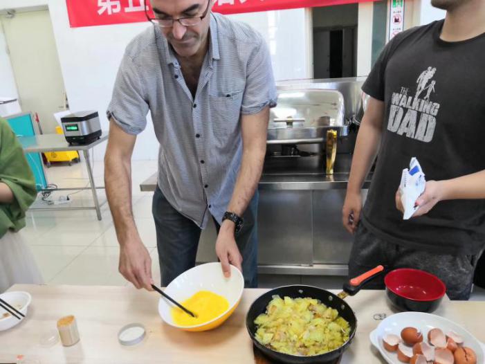 David老师则带领西语班的同学们“征战“”厨房。土豆饼的处理工序稍稍复杂,需要用到油锅进行煎煮。大家边学边做,齐心协力。先将土豆、培根和火腿油炸至金黄;然后加入事先调好的蛋液,最后出锅,土豆饼的香味弥漫整个房间。让人垂涎。油炸火气大,蛋饼做更佳。