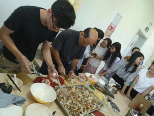 主持人分别介绍了各位外教以及他们将展示的作品。随后由三位外教带头教学,大显身手,带领同学们制作美食。