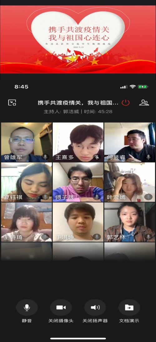 接着,曾老师强调,在境外的同学们如非必要,不要出门。只要外出就有难以预知的风险,生活必需品的购买有条件的话可以使用无接触、在线的方式采购。外出一定做好个人防护,带口罩,不聚集,与他人保持安全距离。外出回家后要做好个人的消毒,勤洗手,居室勤通风。如有发热、乏力、咳嗽、呼吸困难等症状,及时就医,并及时上报各班班长和系里老师。如有必要,大家可以和使馆联络寻求帮助。遵守所在国的防疫规定和法规。不造谣、不传谣,不信谣。谨记学生身份,在做好个人防护的基础上,要保证专业的学习。毕业班同学要抓紧毕业论文写作,及时与指导老师联系。学业上有困难,可直接与老师们联系。同时,国外情况特殊,请同学们也要尽到子女们的责任,时常与自己父母联系,让父母安心放心。同学们都平安归国,这就是老师们和家长们的最大心愿,咱们一起共同努力。