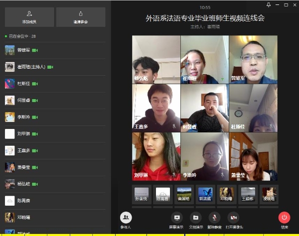 会议伊始,每位同学都热情地与老师同学们打招呼,在国外交换留学的同学和身处祖国各地的同学们全员出席,大家倍感亲切。曾雄军老师说,系里十分关注毕业班同学的就业进展,在这个特殊的学期,会全力帮助大家顺利毕业,曾老师一一关心每位同学目前的情况,大家依次对目前就业进展、未来规划以及就业或升学过程中遇到的问题进行了简要介绍,曾老师都进行了耐心解答。在同学们介绍完情况之后,曾老师对大家的情况进行了总结,并对出国留学、就业选择、国内读研等类型的发展规划提出了宝贵的建议,他鼓励同学们要把心态放平和,要多读书为今后职业发展做好准备;鼓励同学们到基层、边远和贫困地区就业,贡献自己所学。法语教研室主任金老师就同学们关心的毕业论文答辩、专八考试等问题进行了详细解答。金老师建议同学们要克服困难按照既定的时间表完成毕业论文撰写工作,以便留出更多的时间集中精力求职。此外,金老师也就专业选择和专业学习给保研、考研的同学提出了建议。法语教研室副主任曲老师建议同学们要结合未来就业目标进行学业选择,在了解自己兴趣爱好基础上择业,要主动争取好的就业机会,把握当下,并预祝所有同学一切顺利。辅导员郭老师针对毕业生就业手续的办理及档案户口等同学们关心的问题进行了解答。