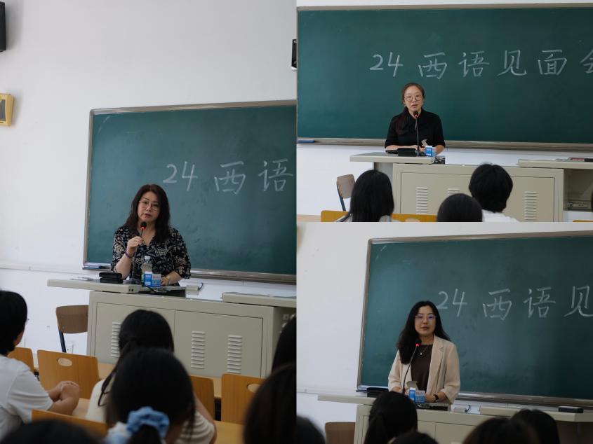 出席西语专业见面会的有:西语教研室主任王晨颖老师、西语教研室副主任张红颖老师以及刘诗扬老师。王晨颖老师详细讲解了西语专业的课程设置与辅修、留学等基本情况,并破除了网络舆论中唱衰小语种专业对新生的消极影响,使新生们以更明确的目标、更清晰的规划和更积极的态度迎接未来的专业学习生活。其后,张红颖老师和刘诗扬老师也对同学们即将到来的西语学习与校园生活提出建议,并为同学们送上真挚的祝福。