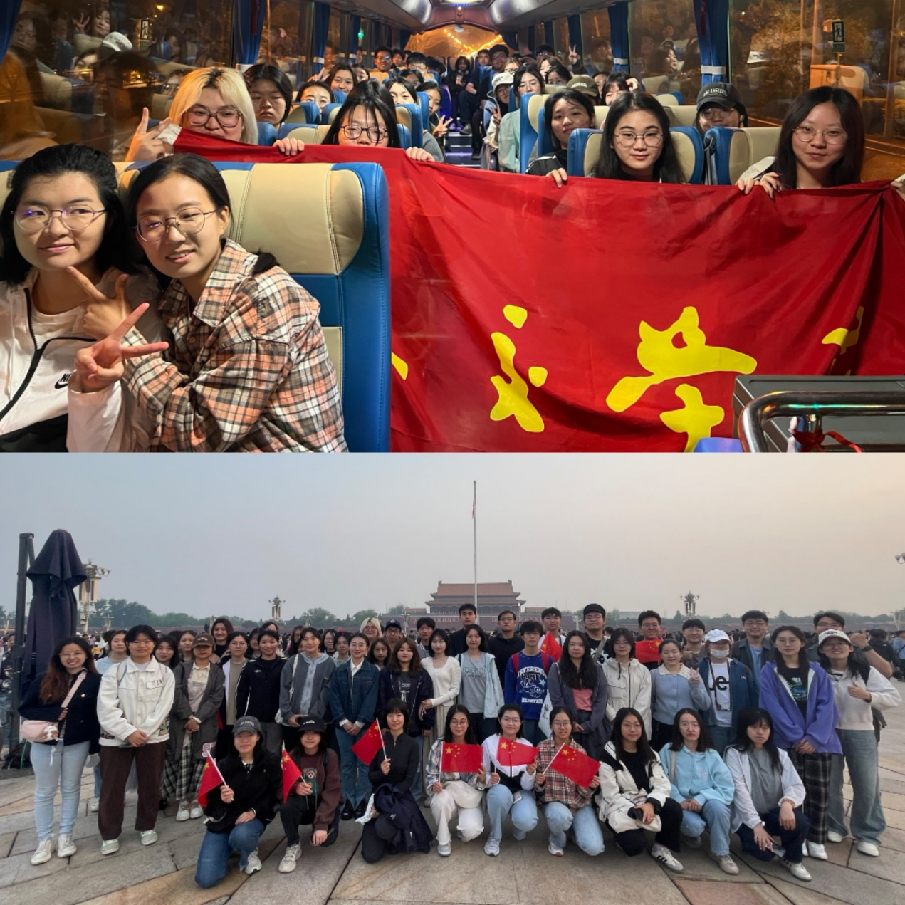 4月27日凌晨两点,夜色正浓,同学们迅速集结,怀着激动的心情前往天安门广场。抵达现场,同学们融入到祖国各地前来观礼的人群中。隔着长安街,仰望天安门,毛主席像两侧,“中华人民共和国万岁”“世界人民大团结万岁”两行大字熠熠生辉,尽显大国气派,自豪感油然而生。