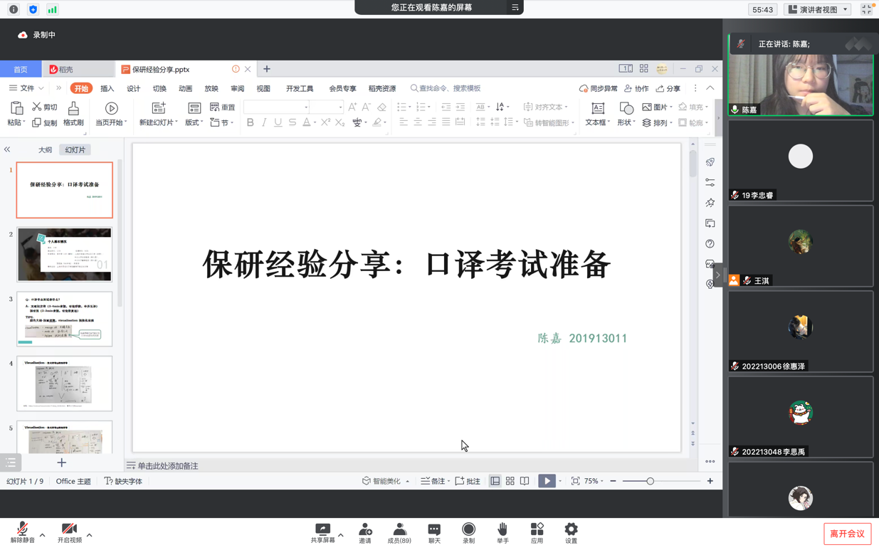第三位分享者是法语专业的陈嘉学姐,她保研到了上海外国语大学的法汉口译专业。陈嘉学姐从自身专业出发,主要分享了口译考试准备方面的经验。首先,对于口译专业考试的无笔记交传和视听说,陈嘉学姐建议同学们构建脑内逻辑大纲,利用定式符号和特殊符号帮助自己记忆。同时,应当重视日常句式的练习和同义词替换的积累。最后,学姐强调了几个面试时的细节:要有适当的的眼神交流,口译时以语句流畅通顺为重。