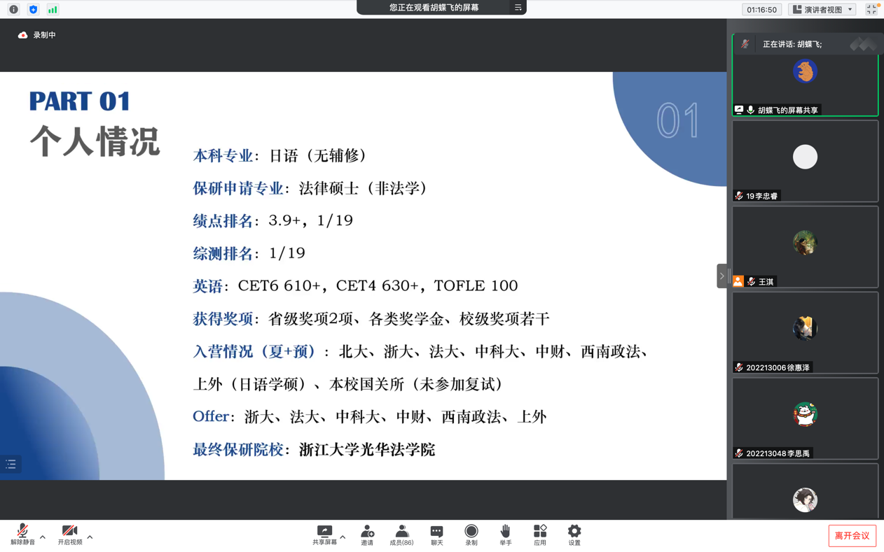 第四位分享者是日语专业的胡蝶飞学姐,她保研到了浙江大学的光华法学院。作为专业绩点和综测的第一,她从简历材料关、复试关两个方面展开分享。在简历材料方面,胡蝶飞学姐强调了教育背景、科研竞赛、社会实践的重要性,同时提醒同学们重视英语方面的学习。而在复试考察方面,胡蝶飞学姐简单介绍了笔试和面试的题型,接着以法学为例,强调了法律思维的培养与法律基础的学习,为希望保研法学的同学提供了极其有用的意见。