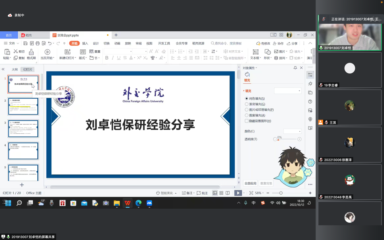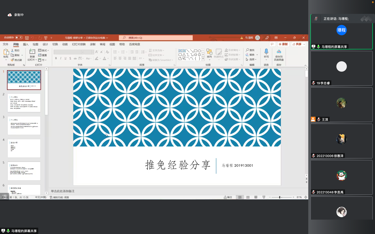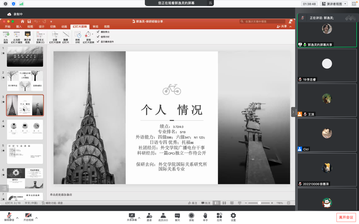 第一位分享者是法语专业的马璟程学长,他保研到了南开大学的国别区域研究专业。学长从保研条件、推免面试、专业选择等四个方面展开分享,首先强调了绩点对于保研的重要性,并结合自己的面试经验,告诫同学们应当重视口语的训练与保研相关材料的整理。同时以自身的国别区域研究专业为例,分享了专业选择方面的建议。最后,马璟程学长为同学们送上寄语:稳定心态,前程似锦。