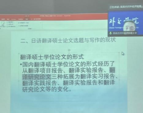 2021年3月29日(周一)下午,必一运动(Bsports)官方网站日语教研室周萍萍老师邀请对外经贸大学日语MTI负责人、《日语学习与研究》杂志社副总编辑吴英杰副教授,为我院日语语言文学及日语口译专业研一的同学们举办了一场题为“日语硕士学位论文选题与写作”的线上讲座。